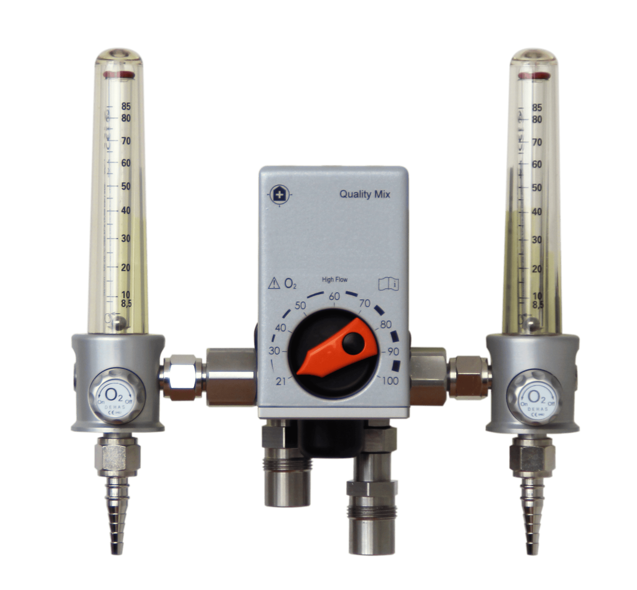 Newly released in the Canadian market, the Dehas Oxygen Blender is the only device available in the market that is built 100% from aluminum inside-out. With an integrated bleed valve that allows for accurate FiO2 at different flows, this unit provides accurate mixing of medical oxygen and medical air. The bleed valve also acts as a silencer for the bleed sound, making this blender the quietest to operate.