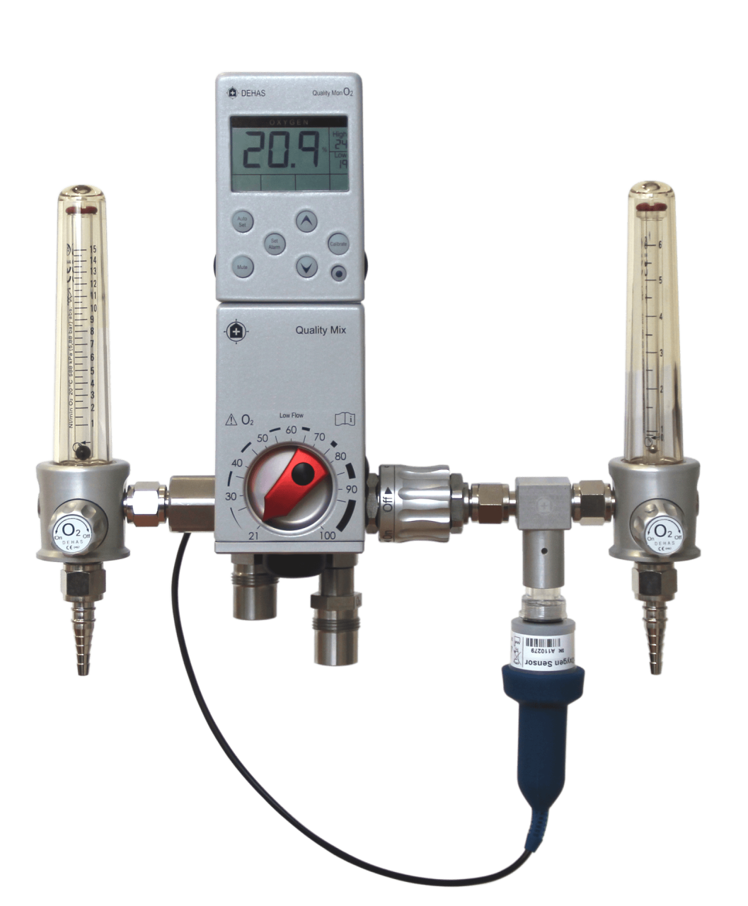 The OxyMixer is available in high and low flow configurations. You can also option the unit with an integrated O2 analyzer, which sits on top of the device and uses a galvanice oxygen cell and a blender buddy to measure the output of your device and display it on a digita screen.